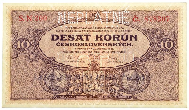 Beschreibung: Csehszlovákia 1927. 10K "NEPLATNÉ (Minta)" perforációval "S.N 200 C. 878307" T:I / Czechoslovakia 1927. 10 Korun with "NEPLATNÉ (Specimen)" perforation, "S.N 200 C. 878307" C:UNC