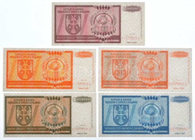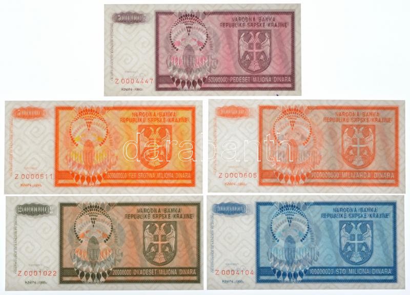 Horvátország / Krajna Szerb Köztársaság / Knin 1993. 20.000.000D + 50.000.000D + 100.000.000D + 500.000.000D + 1.000.000.000D. Mindegyik "Z" kezdetű sorszámmal T:I,I- az egyiken apró tintafolt /