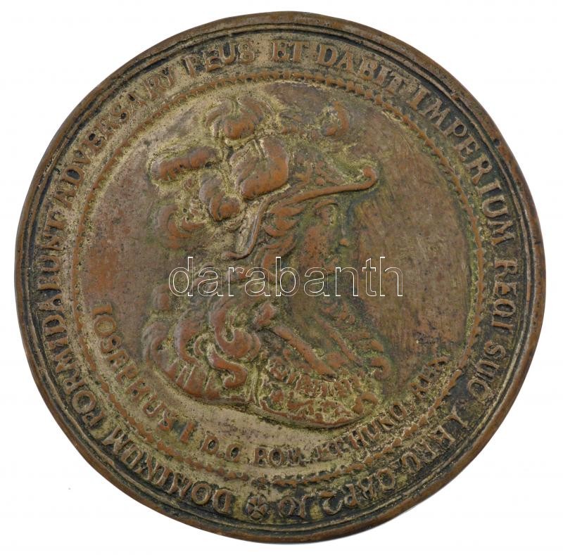 Ausztria (?) DN "I. József" kétoldalas ezüstözött bronz emlékérem "JOSEPHUS I D.C. ROM ET HUNG. REX - DOMINUM PORMIDABUNT ADVERSARY PEUS ET DABIT IMPERIUM REGI SUG / POTENS IN TERRA ERIT SEMEN EIUS - GENERATIO RECTORUM BENEDICETUR" (78mm) T:2- patina, kopott ezüstözés /