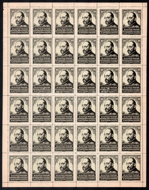 Beschreibung: 1918 Az alföldi magyar közművelődési egyesület alapítójának emlékére levélzáró hajtott teljes ív / label folded complete sheet