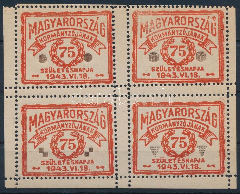 Beschreibung: 1943 Magyarország kormányzójának 75. születésnapjára levélzáró négyestömb / label