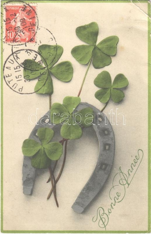 1909 Bonne Année / New Year greeting art postcard with clovers and hor... https://www.darabanth.com/de/390-Fernauktion/390.0/Ansichtskarten/GruC39Fkarten-Feste~1500099/1909-Bonne-Annee-New-Year-greeting-art-postcard-with-clovers-and-horseshoe-EB~II2351890