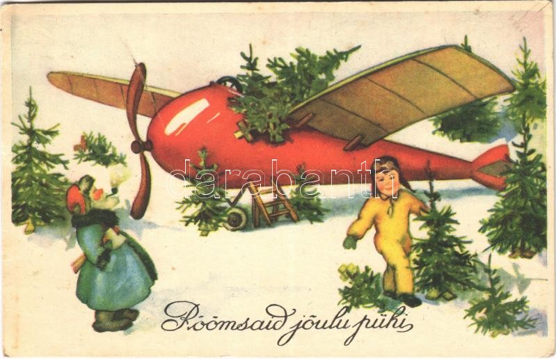Beschreibung: 1939 Röömsaid joulupühi / Estonian Christmas greeting art postcard, Saint Nicholas with Christmas trees, airplane and pilot (EK)