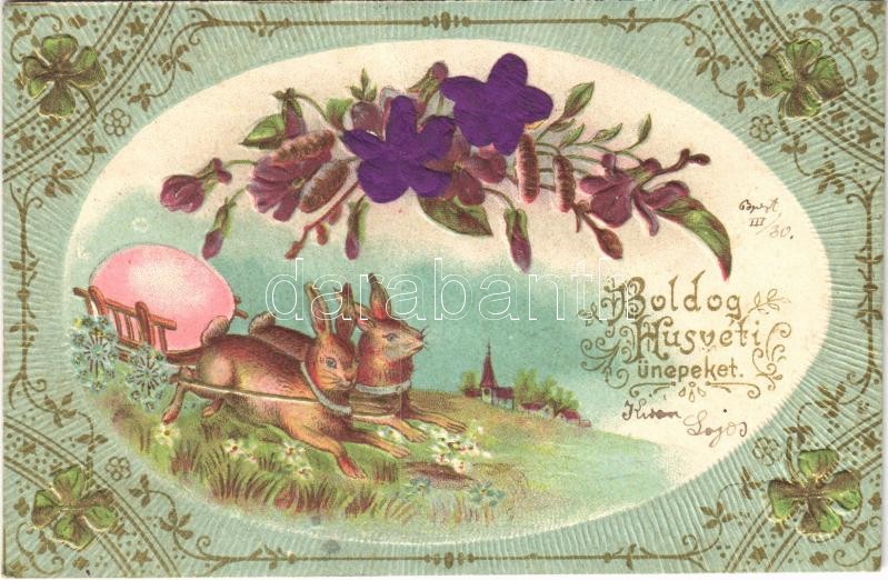 Beschreibung: Boldog húsvéti ünnepeket, nyúlszán tojásokkal. Dombornyomott selyem litho lap / Easter, rabbit sled with eggs. Emb. litho silk card