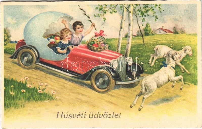 Húsvéti üdvözlet / Easter greeting art postcard with automobile, eggs ... https://www.darabanth.com/de/390-Fernauktion/390.0/Ansichtskarten/GruC39Fkarten-Feste~1500099/Husveti-udvozlet-Easter-greeting-art-postcard-with-automobile-eggs-and-sheep-Amag-3243~II2344173