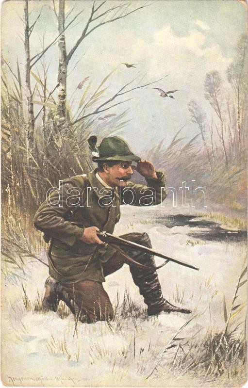 Hunter art postcard, hunter with rifle (EM) https://www.darabanth.com/de/390-Fernauktion/390.0/Ansichtskarten/Jagd~1500101/Hunter-art-postcard-hunter-with-rifle-EM~II2351878