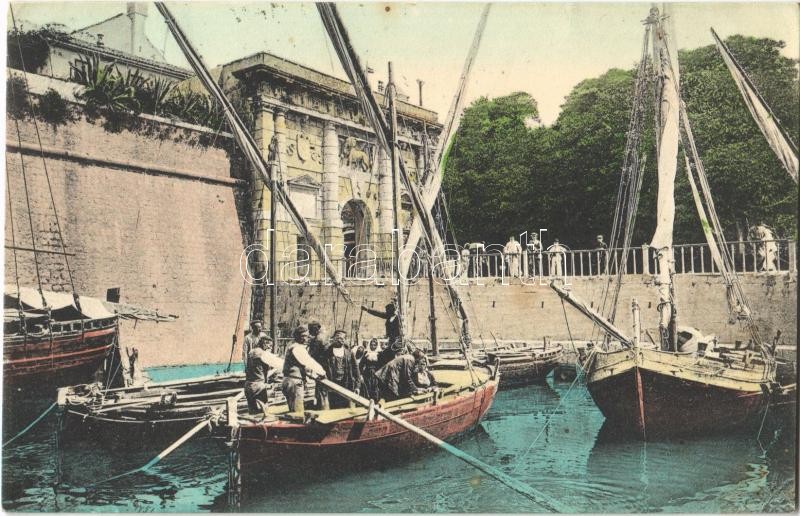 Zadar, Zara; Gradska vrata / city gate, port, fishing boat with fisher... https://www.darabanth.com/de/390-Fernauktion/390.0/Ansichtskarten/Kroatien~1500011/Zadar-Zara-Gradska-vrata-city-gate-port-fishing-boat-with-fishermen-EK~II2104344