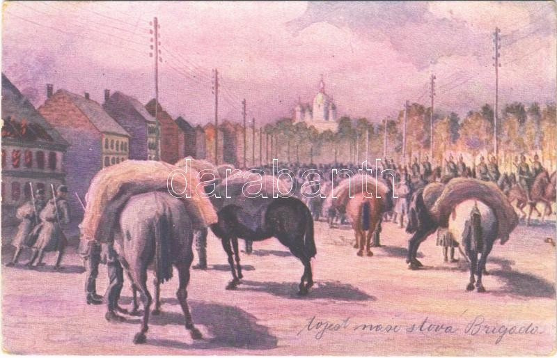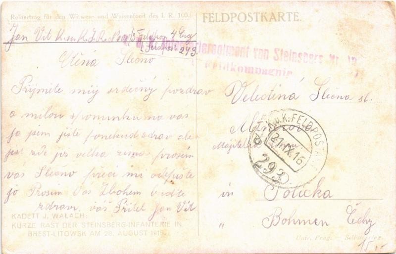 1916 Kurze Rast der Steinsberg-Infanterie in Brest-Litowsk am 28. August 1915. Reinertrag für den Witwen- und Waisenfond des I.R. 100. / WWI Austro-Hungarian K.u.K. military art postcard, charity fund s: Kadett J. Walach + "K.u.K. Infanterieregiment von Steinsberg Nr. 100. 3. Feldkompagnie" (EK)