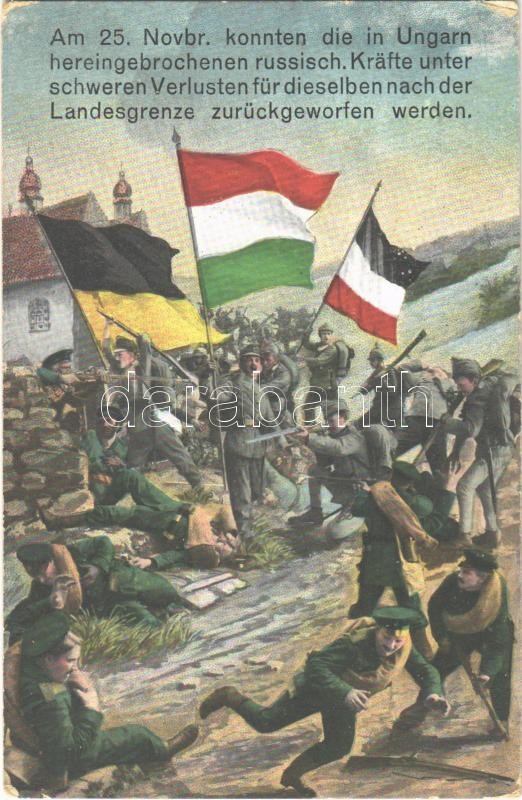 Am 25. Novbr. konnten die in Ungarn hereingebrochenen russisch. Kräfte unter schweren Verlusten für dieselben nach der Landesgrenze zurückgeworfen werden / WWI German and Austro-Hungarian K.u.K. military art postcard. M.B.L. 1471. (EK)