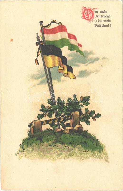 Beschreibung: O du mein Österreich, O du mein Vaterland! / WWI Austro-Hungarian K.u.K. military propaganda, Hungarian and Austrian flags. litho (fl)