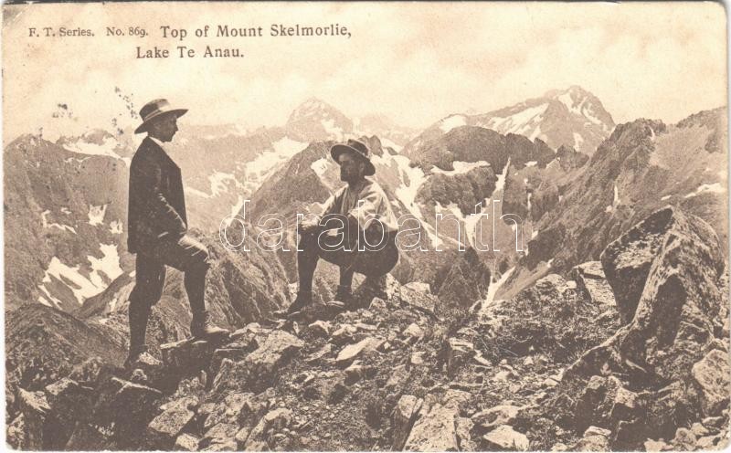 Lake Te Anau, Top of Mount Skelmorlie, hikers (wet damage) https://www.darabanth.com/de/390-Fernauktion/390.0/Ansichtskarten/Neuseeland~1500112/Lake-Te-Anau-Top-of-Mount-Skelmorlie-hikers-wet-damage~II2351849