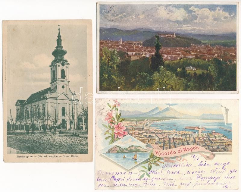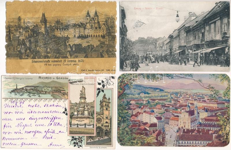 7 db RÉGI külföldi és történelmi magyar város képeslap vegyes minőségben, lithokkal / 7 pre-1945 European and Hungarian town-view postcards in mixed quality, some lithos