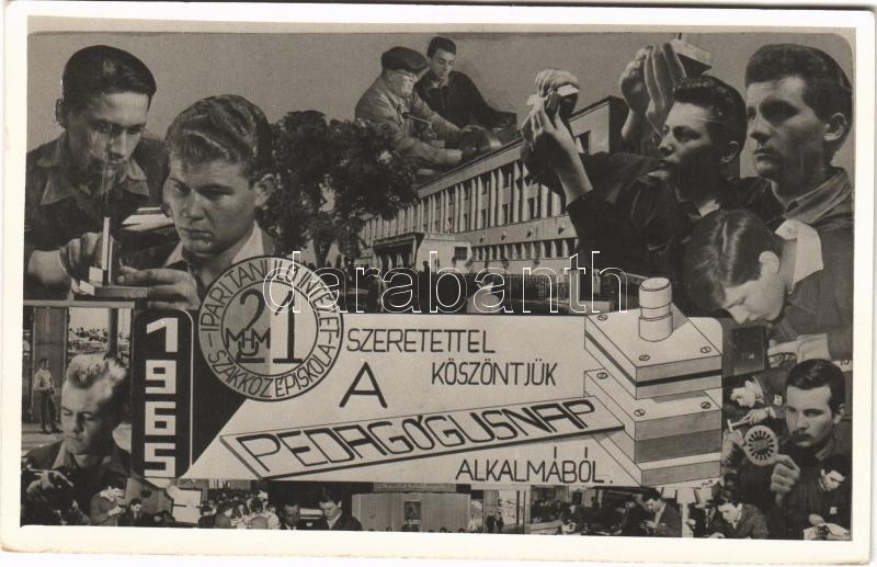 Beschreibung: 1965 Szeretettel köszöntjük a pedagógusnap alkalmából: MÜM 21. Ipari tanuló intézet és szakközépiskola. Magyar szocialista propaganda / Hungarian Socialist propaganda