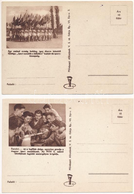 2 db modern propaganda képeslap (Művészeti Alkotások): Magyar ipari tanulók az MTH 5. számú iskolájának legjobb esztergályos brigádja, "Ipari tanulók a békéért" kultúr- és sportünnepség