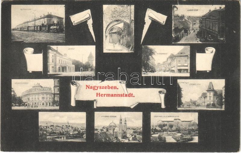 1912 Nagyszeben, Hermannstadt, Sibiu; pályaudvar, vasútállomás, Pempflinger utca, Burger utca, Nagydisznódi utca, színház, Földhitelintézet, Schewis utca, Görögkeleti román templom, Erlen park és Osztrák-magyar helyőrségi kórház / railway station, street view, theatre, bank, Orthodox church, park, K.u.K. military garrison hospital (EK)