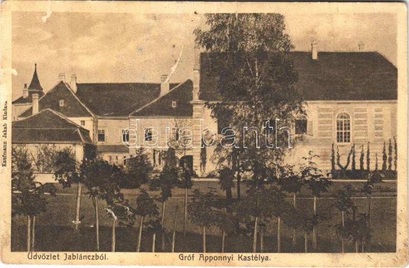 Jablánc, Nyitra-Jablonic, Jablonica; Gróf Apponyi kastélya / castle (f... https://www.darabanth.com/de/390-Fernauktion/390.0/Ansichtskarten/Slowakei~1500007/Jablanc-Nyitra-Jablonic-Jablonica-Grof-Apponyi-kastelya-castle-fl~II2346833