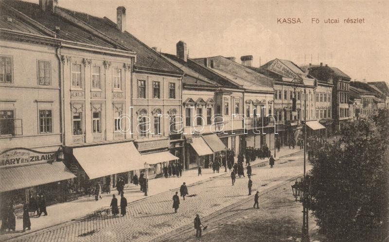 Beschreibung: Kassa, Kosice; Fő utca, Grünwald Testvérek, Vizy Domokos üzletei. Nyulászi Béla kiadása / main square, shops