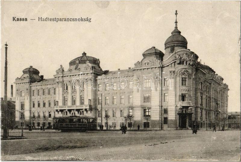 Kassa, Kosice; Hadtestparancsnokság, villamos / Army Headquarters, tra... https://www.darabanth.com/de/390-Fernauktion/390.0/Ansichtskarten/Slowakei~1500007/Kassa-Kosice-Hadtestparancsnoksag-villamos-Army-Headquarters-tram~II2130397