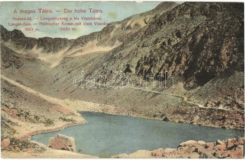 Tátra, Magas Tátra, Vysoké Tatry; Hosszú tó, Lengyel nyereg a kis Viszokával / Langer See, Polnischer Kamm mit klein Viszoka / Dlhé pleso, Polsky hreben, Vychodná Vysoká (Rb)