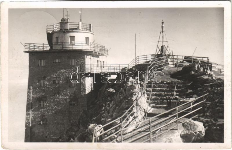 Tátra, Magas-Tátra, Vysoké Tatry; Stanica lanovky na Lomnickom stíte / Station der Seilbahn auf der Lomnitzer Spitze / drótkötél vasútállomás a Lomnici-csúcson / cable railway station, cable car (gyűrődés / crease)