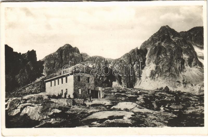 Tátra, Magas-Tátra, Vysoké Tatry; Téryho chata u päti Spisskych ples / Téryschutzhaus bei den Fünfseen / Téry menedékház az Öt-tónál / chalet, lake (képeslapfüzetből / from postcard booklet) (vágott / cut)