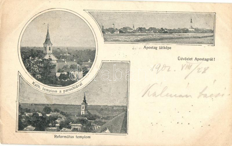 Apostag, Katolikus templom és parókia, Református templom (EK) https://www.darabanth.com/de/390-Fernauktion/390.0/Ansichtskarten/Ungarn~1500004/Apostag-Katolikus-templom-es-parokia-Reformatus-templom-EK~II1053870