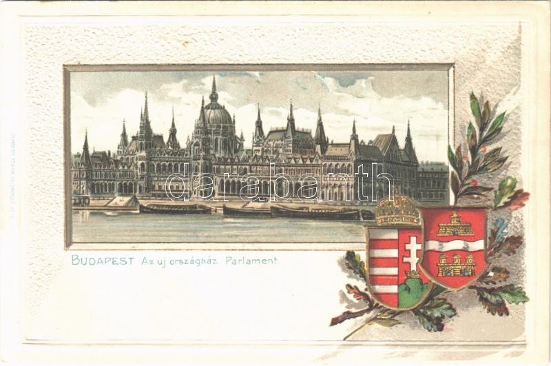 Beschreibung: Budapest V. Országház, Parlament. Szecessziós dombornyomott képeslap magyar címerrel, Art Nouveau, Emb. litho (Rb)