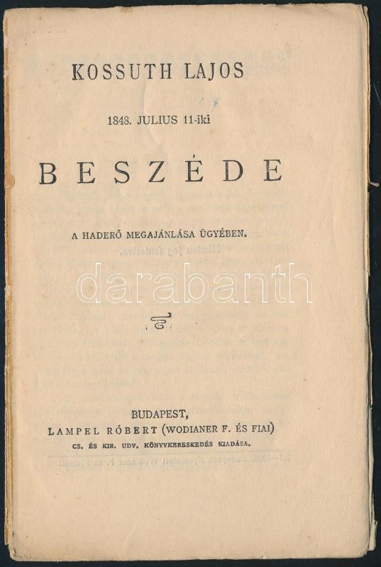 Kossuth Lajos 1848. julius 11-iki beszéde a haderő megajánlása ügyében... https://www.darabanth.com/de/390-Fernauktion/390.0/Bucher/Bucher-Geschichte~1000004/Kossuth-Lajos-1848-julius-11-iki-beszede-a-hadero-megajanlasa-ugyeben-Bp-1898-Lampel-R-~II2345522