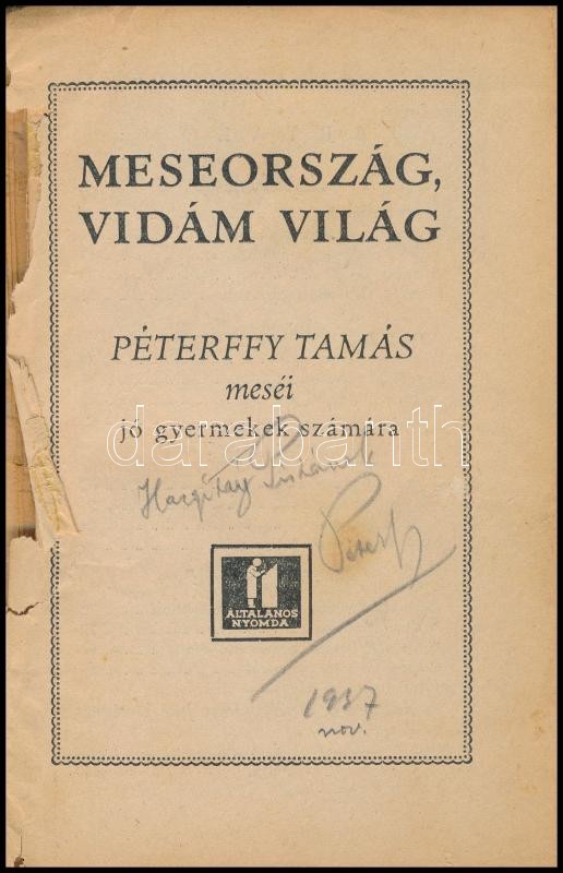 Meseország, vidám világ. Péterffy Tamás meséi. A szerző által dedikált... https://www.darabanth.com/de/390-Fernauktion/390.0/Bucher/Bucher-Marchen~1000017/Meseorszag-vidam-vilag-Peterffy-Tamas-mesei-A-szerzo-altal-dedikalt-es-datalt-1937-no~II2344811