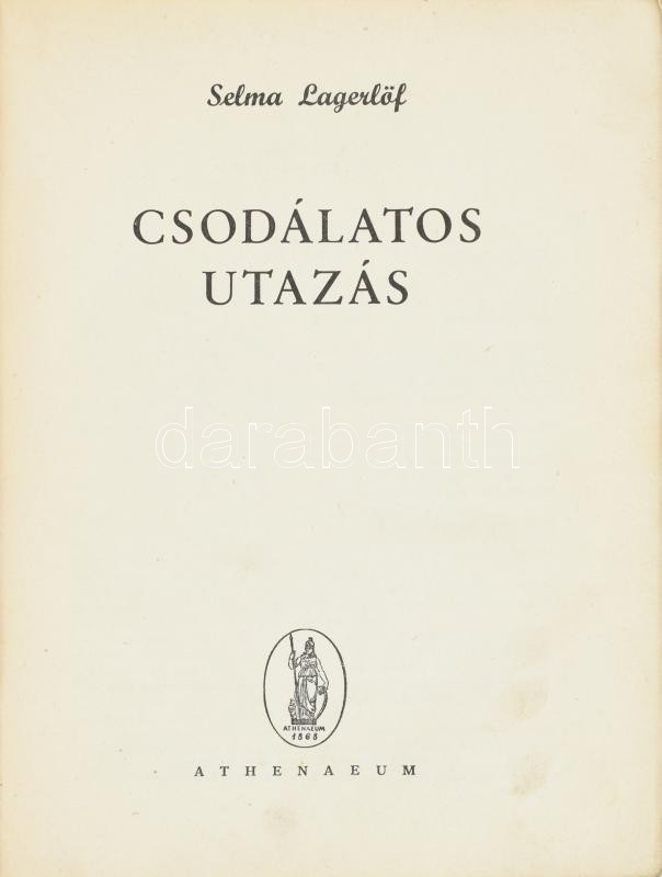 Selma Lagerlöf: Csodálatos utazás. (Nils Holgersson.) Ford.: Kállay Miklós. Róna Emy rajzaival. Bp.,[1949], Athenaeum, 448+ p. + 2 t. (színes). Nagyon gazdag egészoldalas és szövegközti illusztrációkkal, két színes egészoldalas táblával. Kiadói illusztrált félvászon-kötés, kopott, foltos borítóval, laza kötéssel.