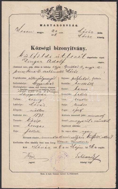 Beschreibung: 1896 Lóvár (Moson vm) községi bizonyítvány külföldi útlevélhez .
