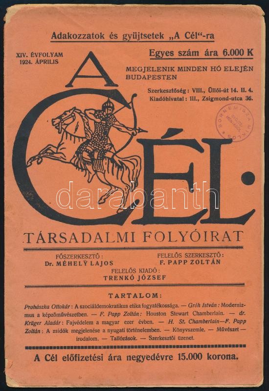 1924 A Cél folyóirat 1924. áprilisi száma https://www.darabanth.com/de/390-Fernauktion/390.0/Kunst-Dokumente-andere-Sammelgebiete/Drucksachen~500033/1924-A-Cel-folyoirat-1924-aprilisi-szama~II2353653