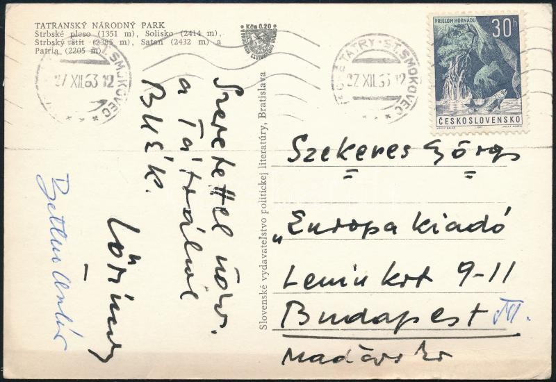 Beschreibung: 1963 Betlen Oszkár (1909-1969) újságÃró, történész aláÃrása egy üdvözlÅ‘ képeslapon a Tátrából egy ismeretlen személy soraival és aláÃrásával. Szekeres György (1914-1973) újságÃró, műfordÃtó, az Európa Kiadó fÅ‘szerkesztÅ‘je részére.