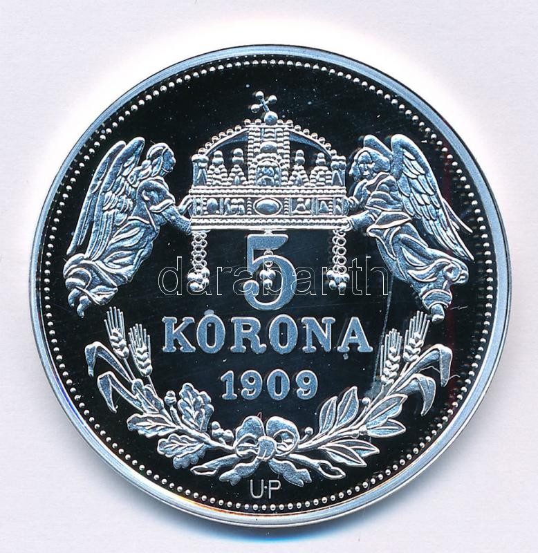 Beschreibung: DN "Királyi koronák - Könyves Kálmán / 5 korona 1909" Ag emlékérem tanúsítvánnyal (20g/0.999/38,61mm) T:PP fo.