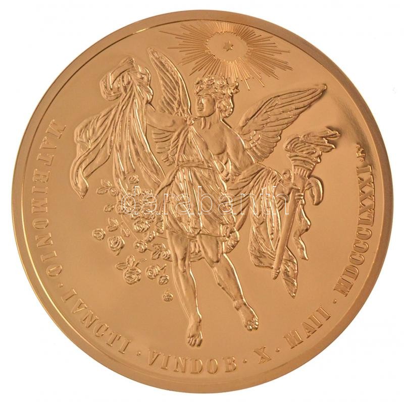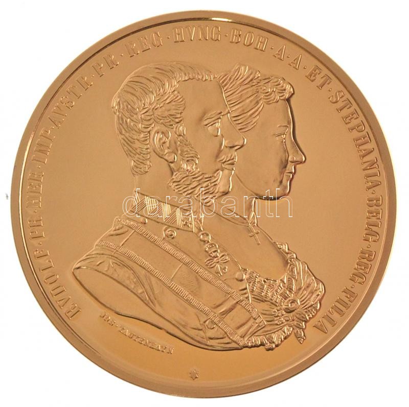 Beschreibung: DN "Magyar Aranyóriások - Ferenc József emlékérem, Rudolf herceg házasságkötése 1881" aranyozott Cu utánveret, tanúsítvánnyal (46mm) T:PP