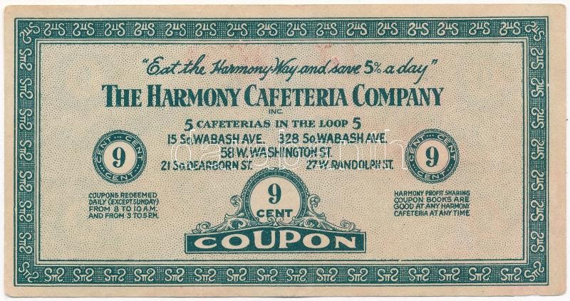 Amerikai Egyesült Államok ~1950. "Harmony Cafeteria Company, Chic... https://www.darabanth.com/de/390-Fernauktion/390.0/Numismatik/Notgeld-aus-Papier-und-Metall~2000006/Amerikai-Egyesult-Allamok-7E1950-Harmony-Cafeteria-Company-Chicago-9c-erteku-kuponja-TII-U~II2347979