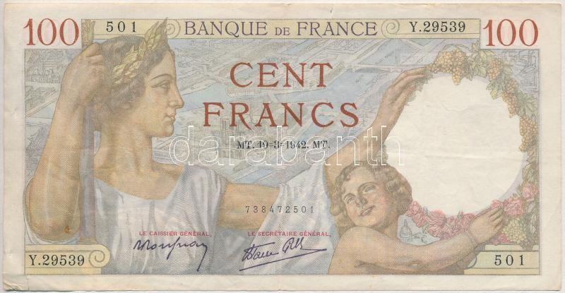 France 1942. 100... https://www.darabanth.com/de/390-Fernauktion/390.0/Numismatik/Weltweit-Banknoten~2000013/Franciaorszag-1942-100Fr-TIII-kis-szakadas-tulyuk-France-1942-100-Francs-CF-small-tear-nee~II2352704