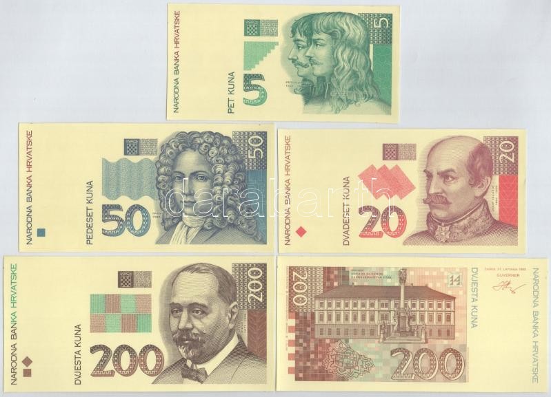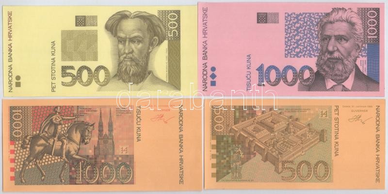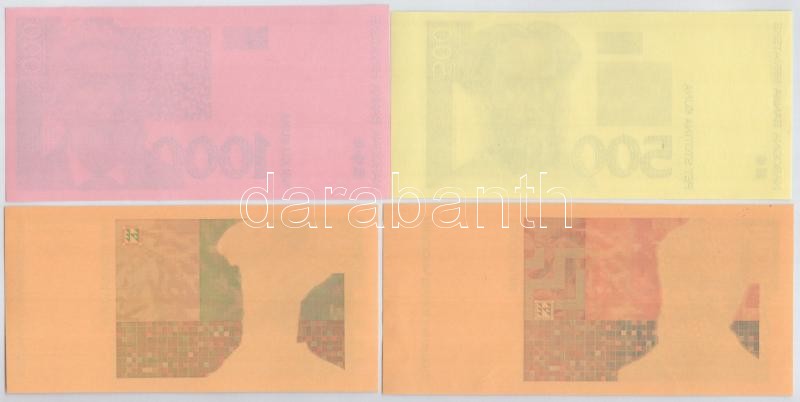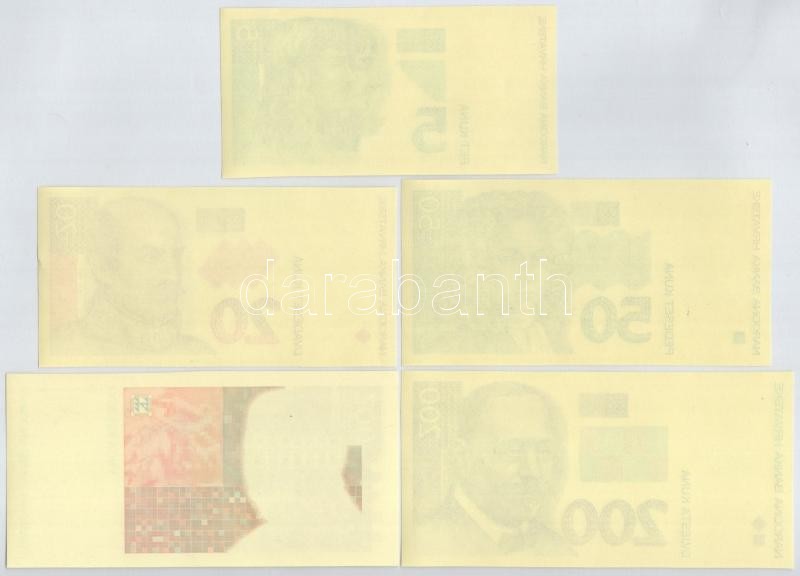Horvátország 1993. 5K + 20K + 50K + 200K + 500K + 1000K, mind előlapi színpróba + 200K + 500K + 1000K, mind hátlapi színpróba T:I,I-