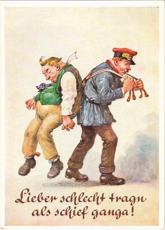 Beschreibung: "Lieber schlecht tragn als schief ganga!" Münchener Bildkunstverlag August Lengauer Nr. 3073. / German drunk humour art postcard