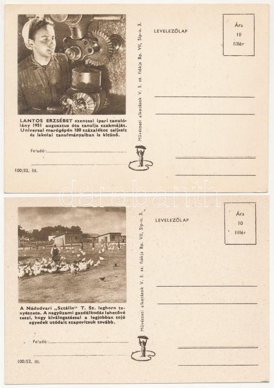 Magyar szocreál munkás propaganda: Nádudvari "Sztálin" TSz. leghorn tenyészete, Lantos Erzsébet szentesi ipari tanulólány - 2 db modern képeslap (Művészeti Alkotások)