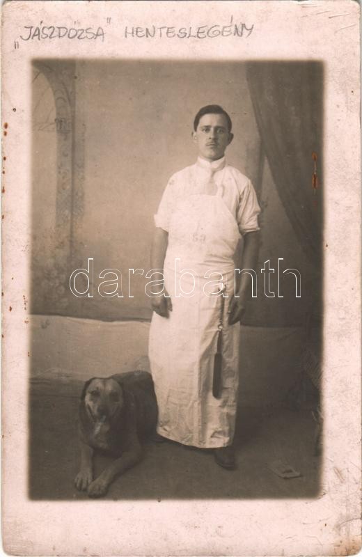 1918 Jászdózsa, henteslegény kutyával. photo (fl) https://www.darabanth.com/de/391-Fernauktion/391.0/Ansichtskarten/Ungarn~1000007/1918-Jaszdozsa-henteslegeny-kutyaval-photo-fl~II2363800