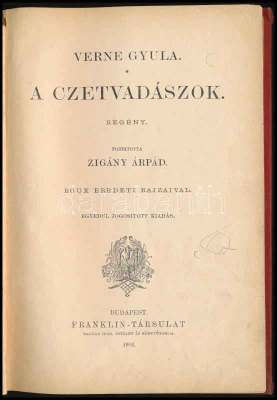 Verne Gyula: A czetvadászok. Fordította Zigány Árpád. Budapest, 1902. Franklin. 158 l. 1 sztl. lev. /Verne Gyula összes munkái./ Festett, aranyozott kiadói vászonkötésben, belül a fűzésnél sérült