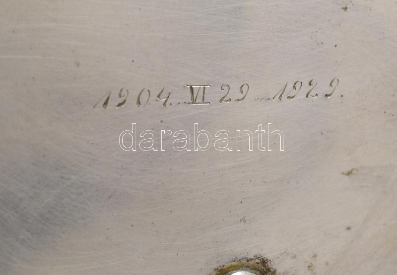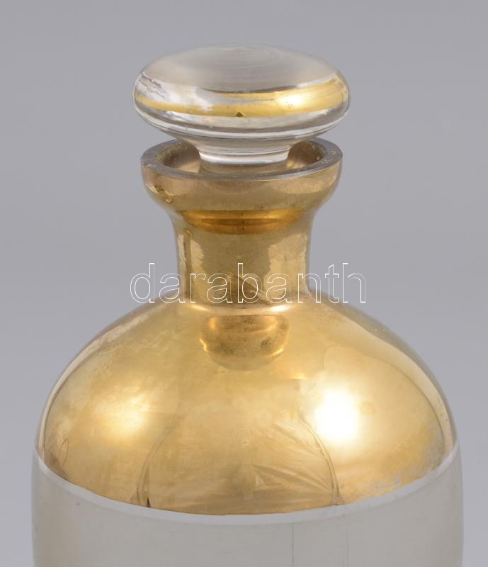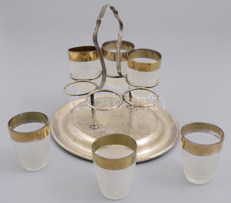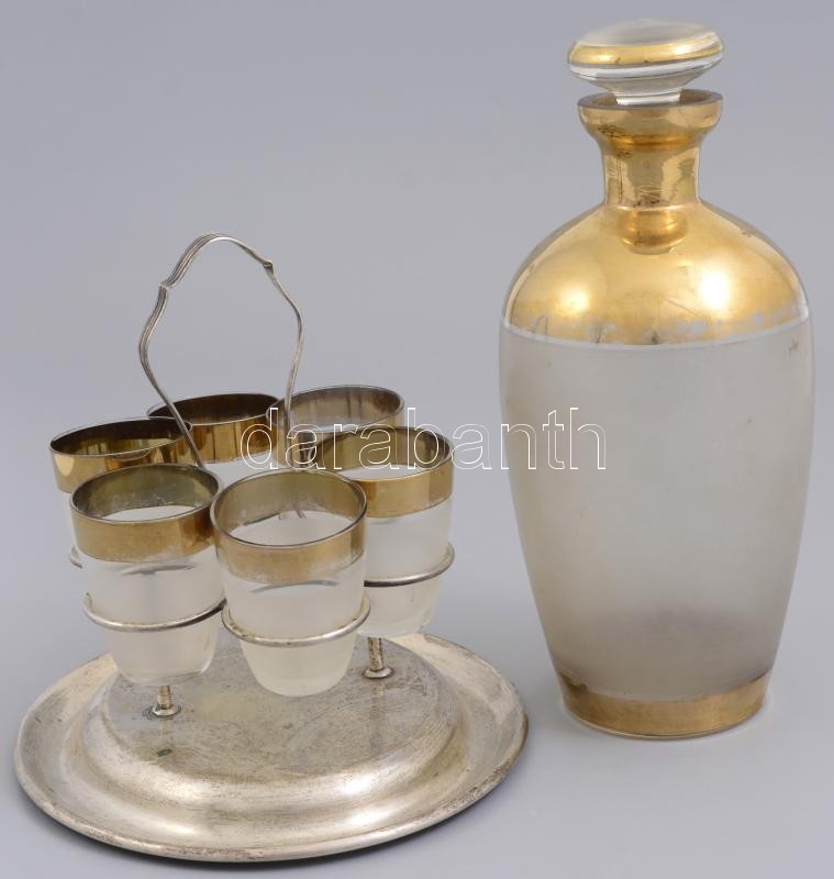 Opálüveg italos készlet ezüst(Ag) pohártartóval, nettó: 161 g, benne aranyozott palack dugóval + 6 db aranyozott feles pohár, kopottak, a palack magassága 18 cm, a poharaké 5 cm, a tartó szélessége 16 cm