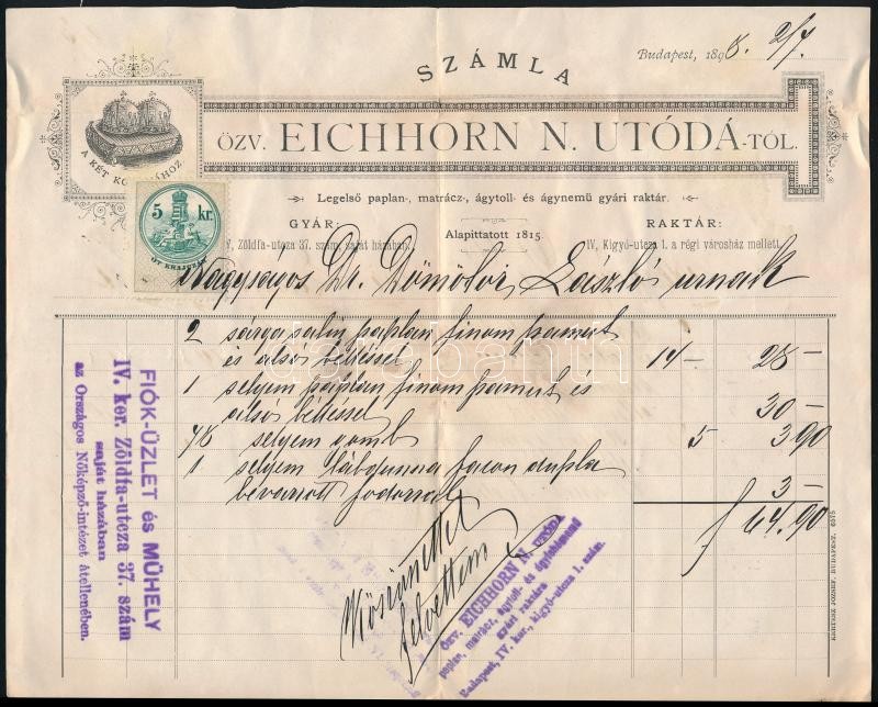Beschreibung: 1898 Bp., Özv. Eichhorn N. Utóda paplan, matrac stb. raktár fejléces számlája 5 kr okmánybélyeggel