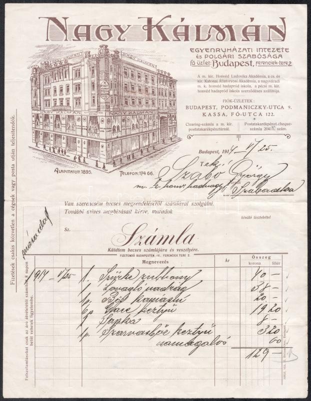 Beschreibung: 1914 Bp. Ferenciek tere, Nagy Kálmán Egyenruházati Intézete és Polgári Szabósága fejléces számla, rajta az üzlet látképével