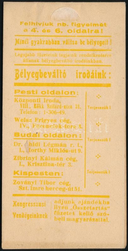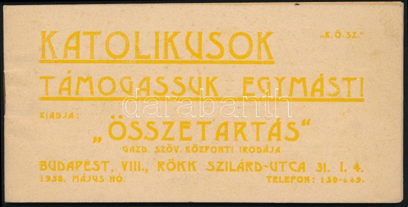 1938 Az "Összetartás" gazdasági szövetkezet ismertető füzete a katolikus cégekről, "Katolikusok támogassuk egymást" jeligével, az Eucharisztikus Kongresszus alkalmából, szép állapotban