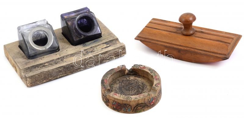 Egy régi íróasztal kellékei: hamutál, tintatartó, tapper, mind kopásnyomokkal, a hamutálon kisebb törés, sz: 18,5 és 17,5 cm, d: 9,5 cm
