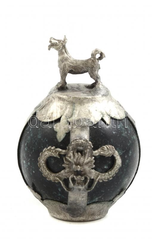 Beschreibung: Jáde színű gömb fém foglalatban, tetején kutyával, m: 5 cm
