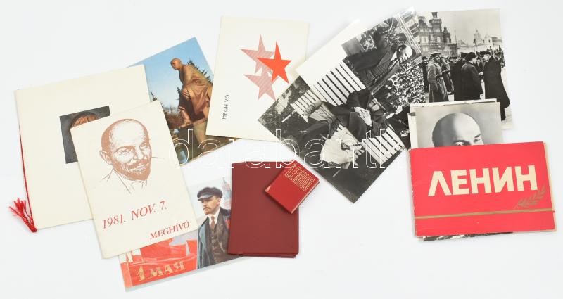 Beschreibung: Leninnel kapcsolatos bolha tétel, közte meghívó, minikönyv, fotók stb., 8 db.