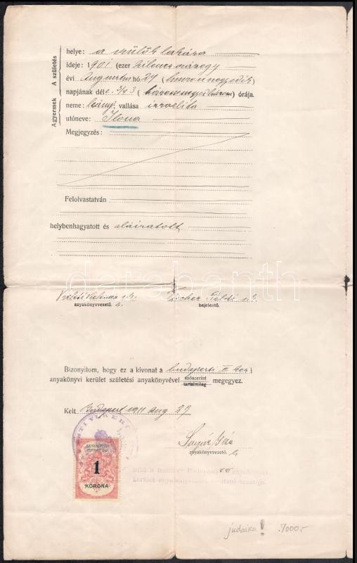 1911 Bp., Születési anyakönyvi kivonat izraelita vallású egyén számára https://www.darabanth.com/de/391-Fernauktion/391.0/Kunst-Dokumente-andere-Sammelgebiete/Judaica~500026/1911-Bp-Szuletesi-anyakonyvi-kivonat-izraelita-vallasu-egyen-szamara~II2362848